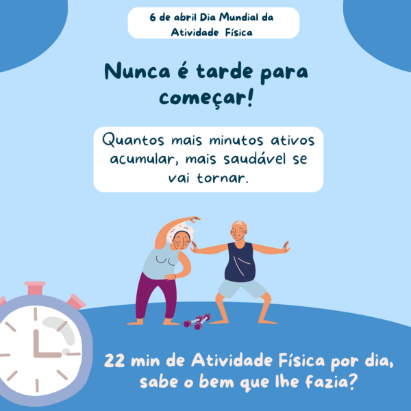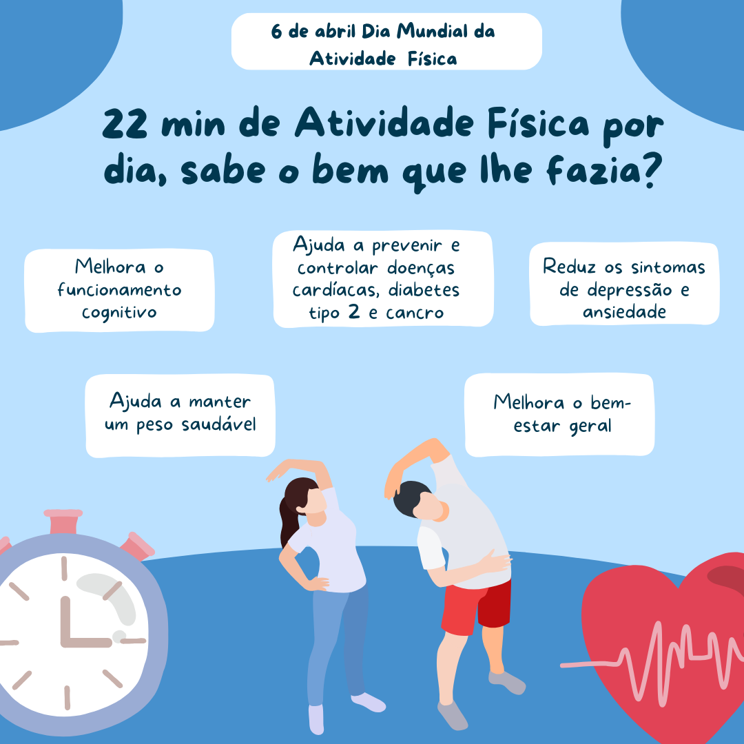 No dia 6 de abril comemora-se o Dia Mundial da Atividade Física, uma iniciativa promovida pela Organização Mundial da Saúde (OMS) que pretende incentivar a prática de atividade física, promover os seus benefícios para a saúde e reduzir o sedentarismo. Em Portugal, 8 em cada 10 jovens (dos 11 aos 17 anos), 5 em cada 10 mulheres adultas e mais de 50% da população acima dos 70 anos são fisicamente inativos. A atividade física, de intensidade moderada ou vigorosa, contribui para a prevenção e controlo de doenças cardiovasculares, diabetes e cancro, reduz os sintomas de depressão e ansiedade, melhora o funcionamento cognitivo, a aprendizagem e o bem-estar, e reduz em 30-60% a taxa de mortalidade, em comparação com a população sedentária.