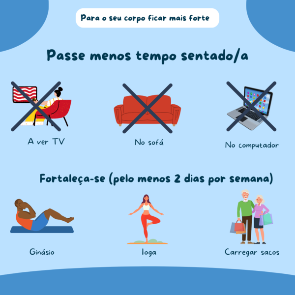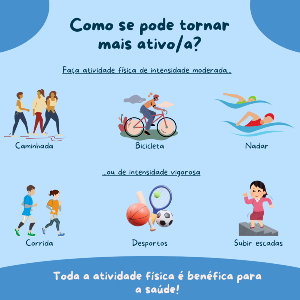 Trocar o elevador pelas escadas, evitar escadas rolantes, preferir as pernas ao carro, caminhar enquanto fala ao telefone, fazer pausas ativas com alongamentos ou exercícios de força, levantar-se da secretária a cada 30 minutos, praticar desporto, fazer jardinagem ou limpar regularmente a casa – estas são algumas das estratégias que pode implementar no dia-a-dia para melhorar a sua saúde. Uma forma rápida de avaliar a intensidade da atividade é perceber se, enquanto a realiza, consegue falar ou cantar: consegue falar e cantar – atividade de intensidade ligeira; consegue falar, mas não cantar – intensidade moderada; não consegue cantar, nem falar – intensidade vigorosa.