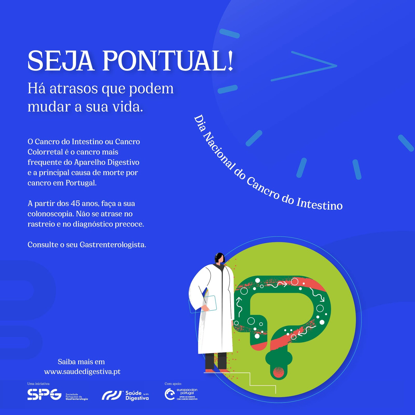 No âmbito do Dia Nacional do Cancro do Intestino, assinalado a 30 de setembro, a Sociedade Portuguesa de Gastrenterologia (SPG), com o apoio da Europacolon Portugal, está a promover uma campanha nacional de consciencialização sobre a doença, sublinhando a importância do rastreio e do diagnóstico precoce a partir dos 45 anos.
