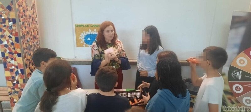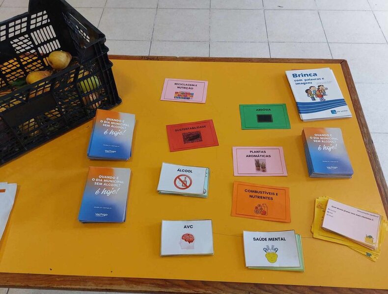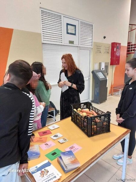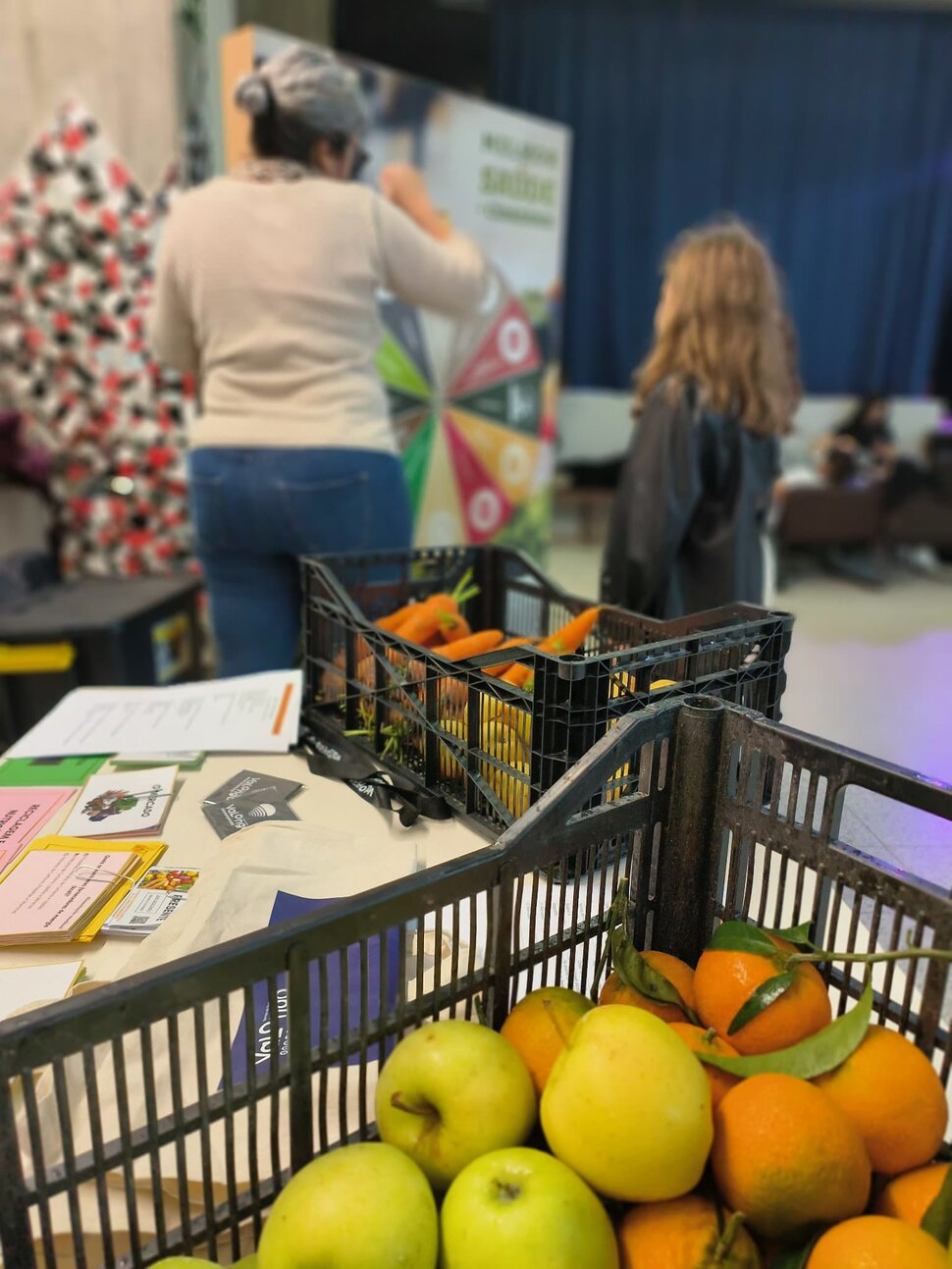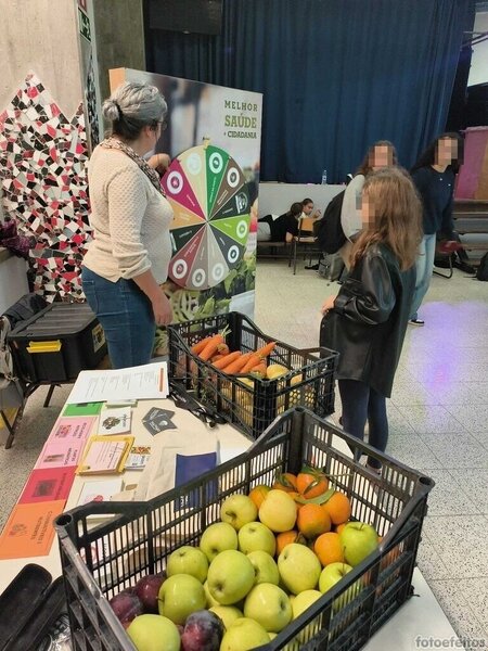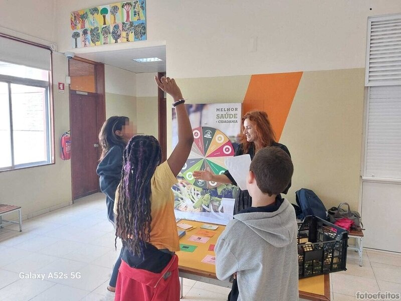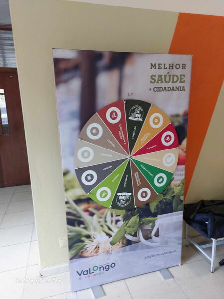 Para incentivar os jovens a adotar uma alimentação mais saudável e sustentável, promovemos uma atividade de “Speed Dating”, relacionada com este tema. Além disso, utilizamos uma 'roda da sorte' que garantia prémios atrativos, como fruta da época e brindes do município, para aqueles que respondiam corretamente às perguntas sobre AVC, sustentabilidade, alimentação e outras temáticas.