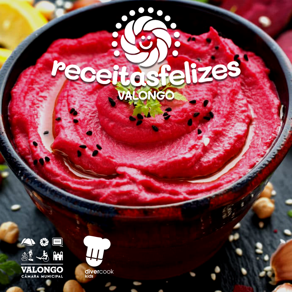 - Num blender colocar o grão de bico, a beterraba cortada em dados, o alho, a pasta de sésamo, o sumo de limão e o azeite. Triturar e temperar a gosto com os cominhos, sal e a pimenta.