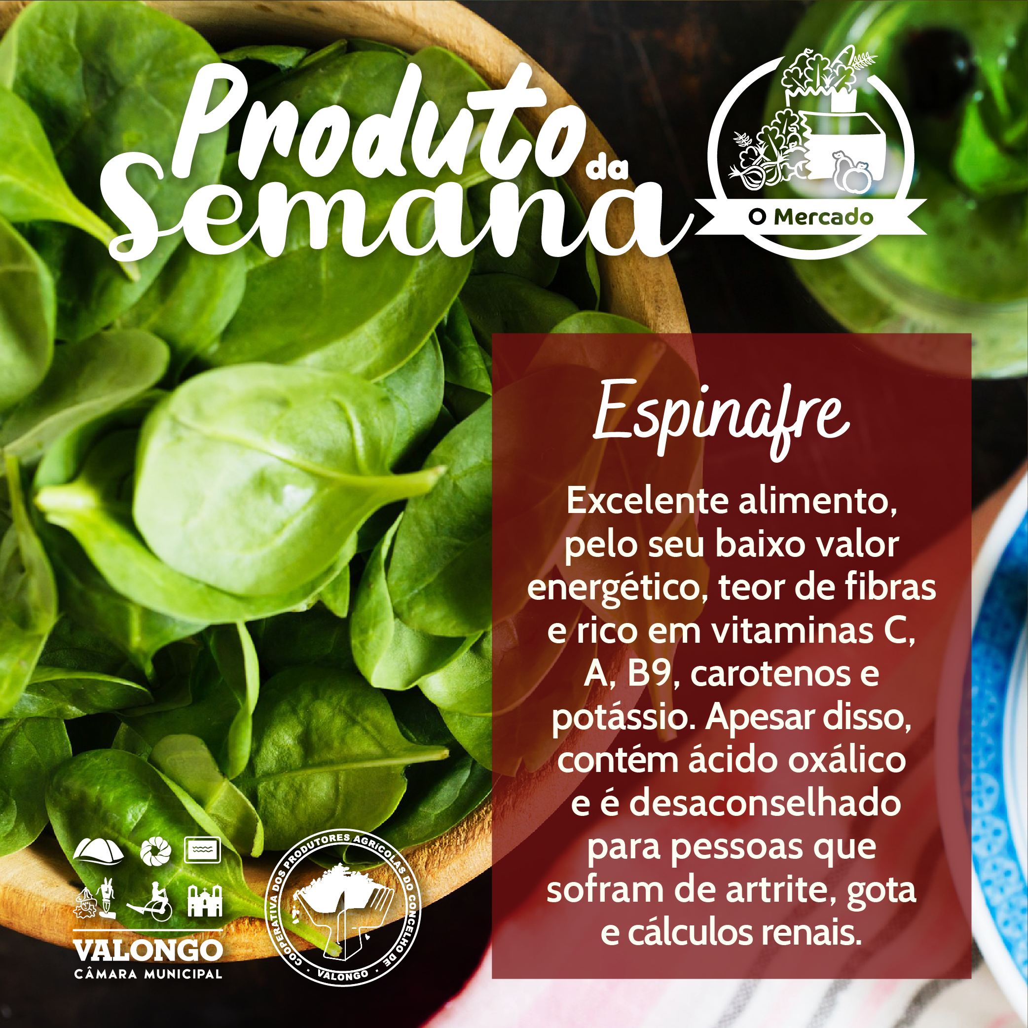 Espinafre, excelente alimento, pelo seu baixo valor energético e quantidade de fibras, vitaminas e minerais. É riquíssimo em Vit C, Carotenos, Vit A, Folatos (B9) e potássio! Apesar disso, contem ácido oxálico o que não é aconselhável a pessoas que sofram de artrite gota e cálculos renais. Pode ser preparado ao natural, o que favorece as suas propriedades naturais ou então pode ser cozinhado de qualquer forma.